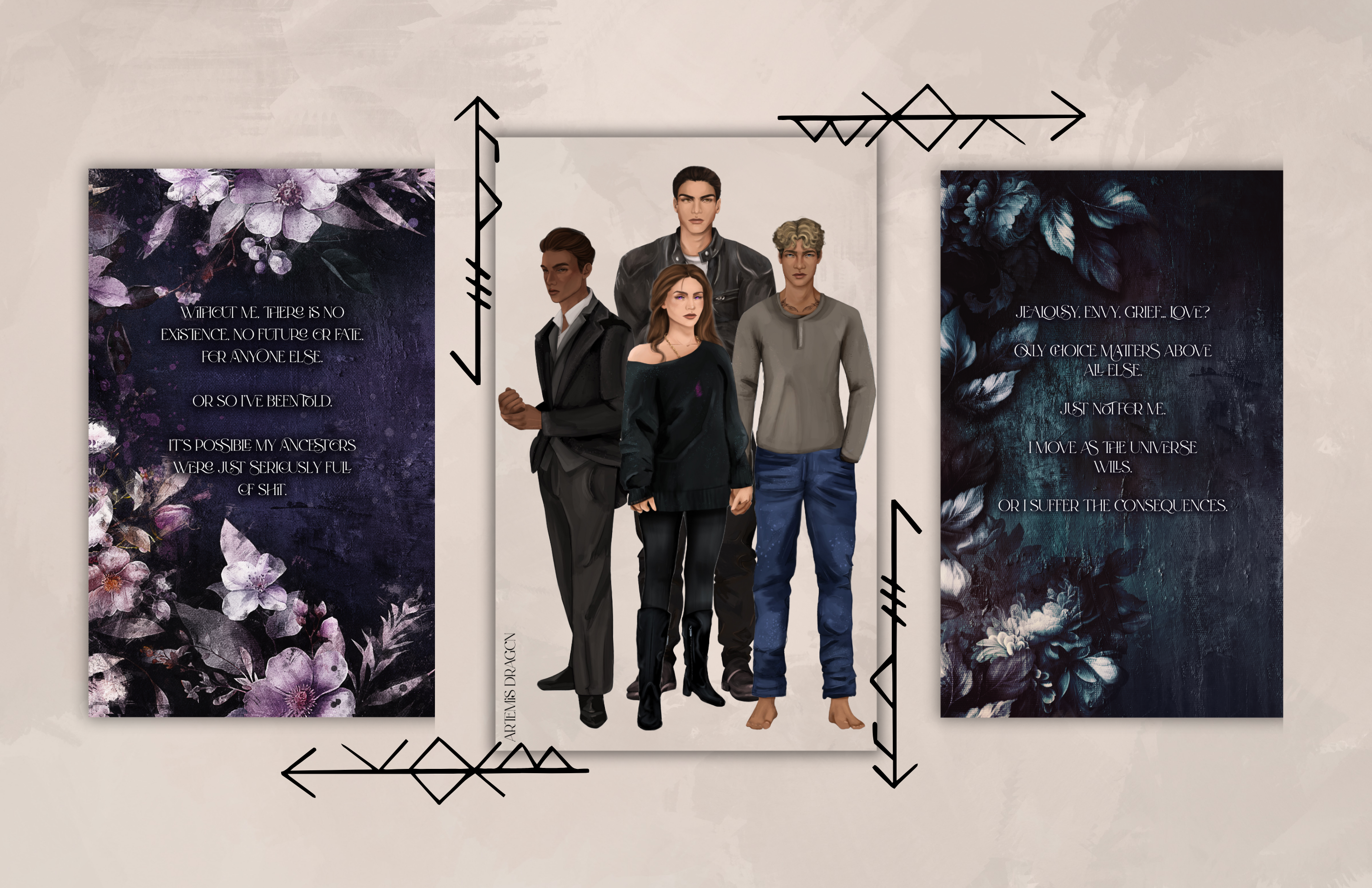 Illustrations by Nicole Deal: Dusk and Sisu, Kellan, and Ravine